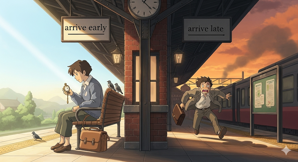 '예정된' '시간'(time)보다 '앞서서'(early) 혹은 '뒤늦게'(late) '도착'하는 행위를 의미합니다. 이는 '시간' 기준'과의 '상대적인' '차이'(difference)를 나타냅니다.