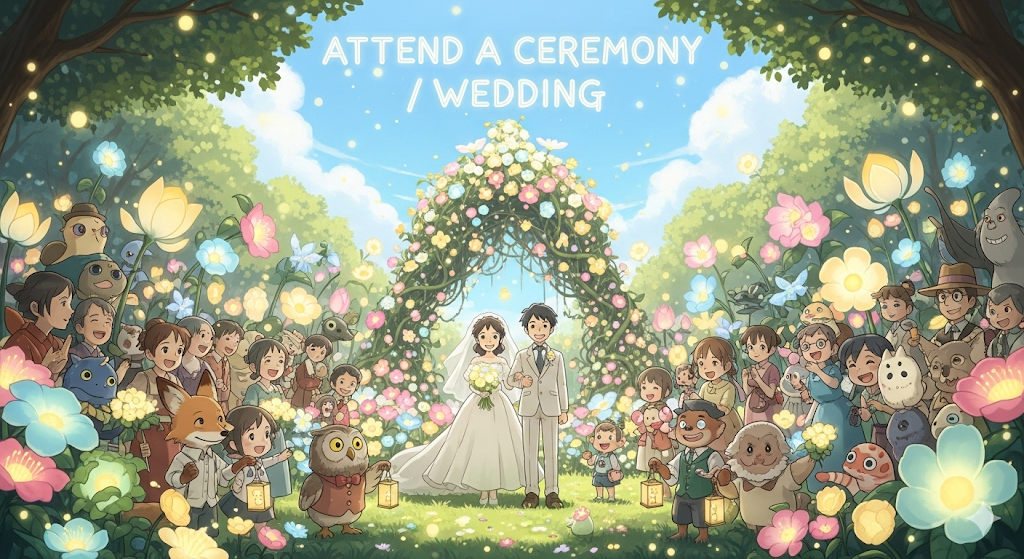 - *'attend a ceremony/wedding'**은 공식적인 축하 행사에 참여하는 것을 나타내며, 주최자에 대한 예의를 갖추는 뉘앙스가 포함됩니다.