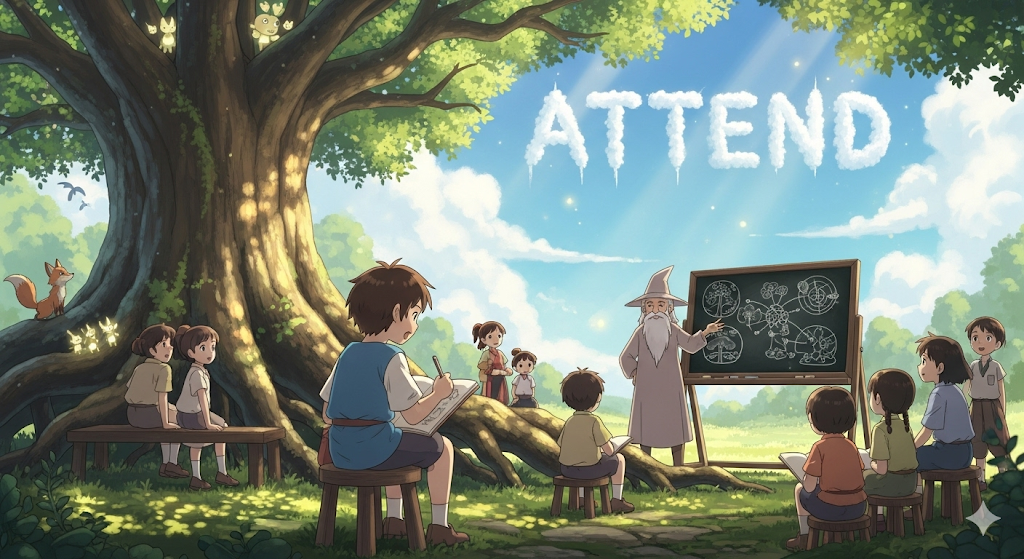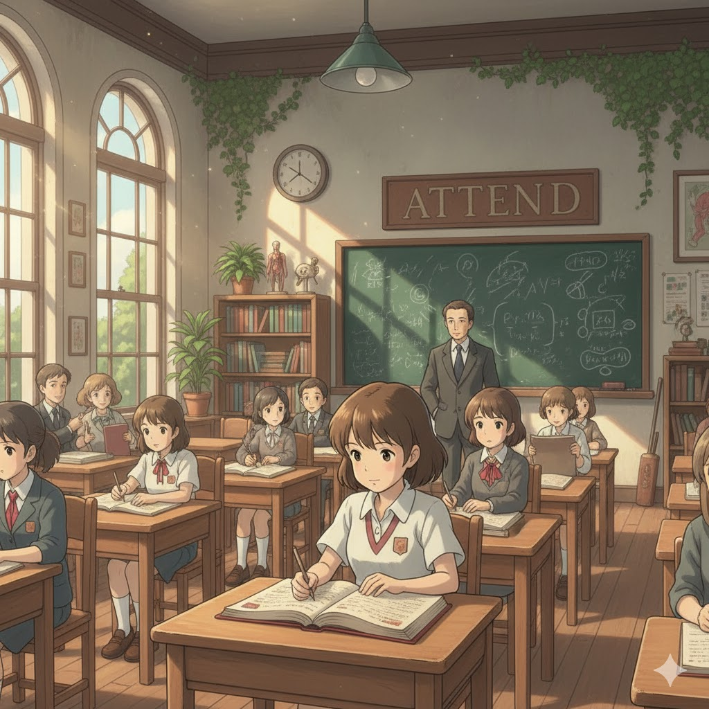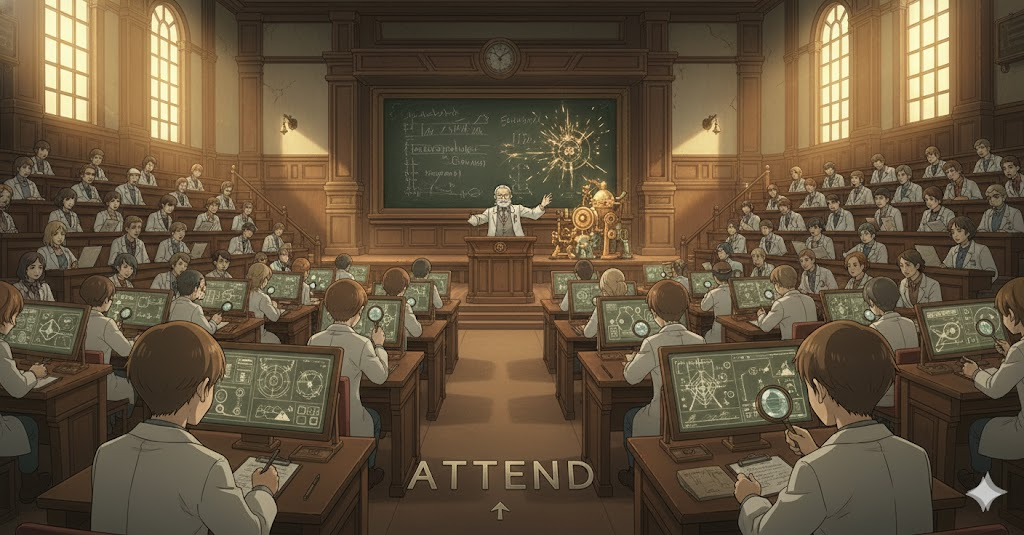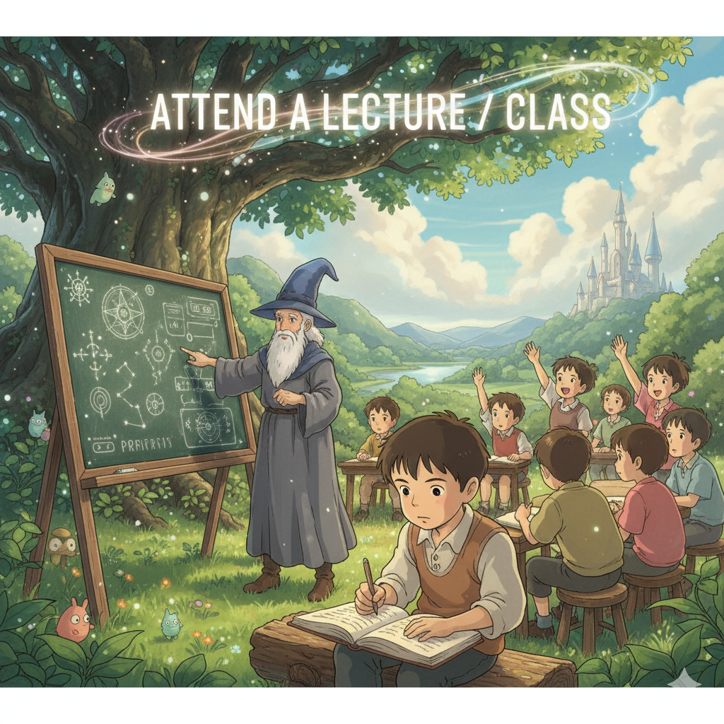 '교수'(professor)나 '교사'가 '제공'하는 '교육적인' '강연'(lecture)이나 '수업'(class)에 '규칙적'으로 '참석'하는 행위를 의미합니다. 이는 '지식'(knowledge) **습득'**과 '학업 규율'(academic discipline) **준수'**에 초점이 맞춰져 있습니다.