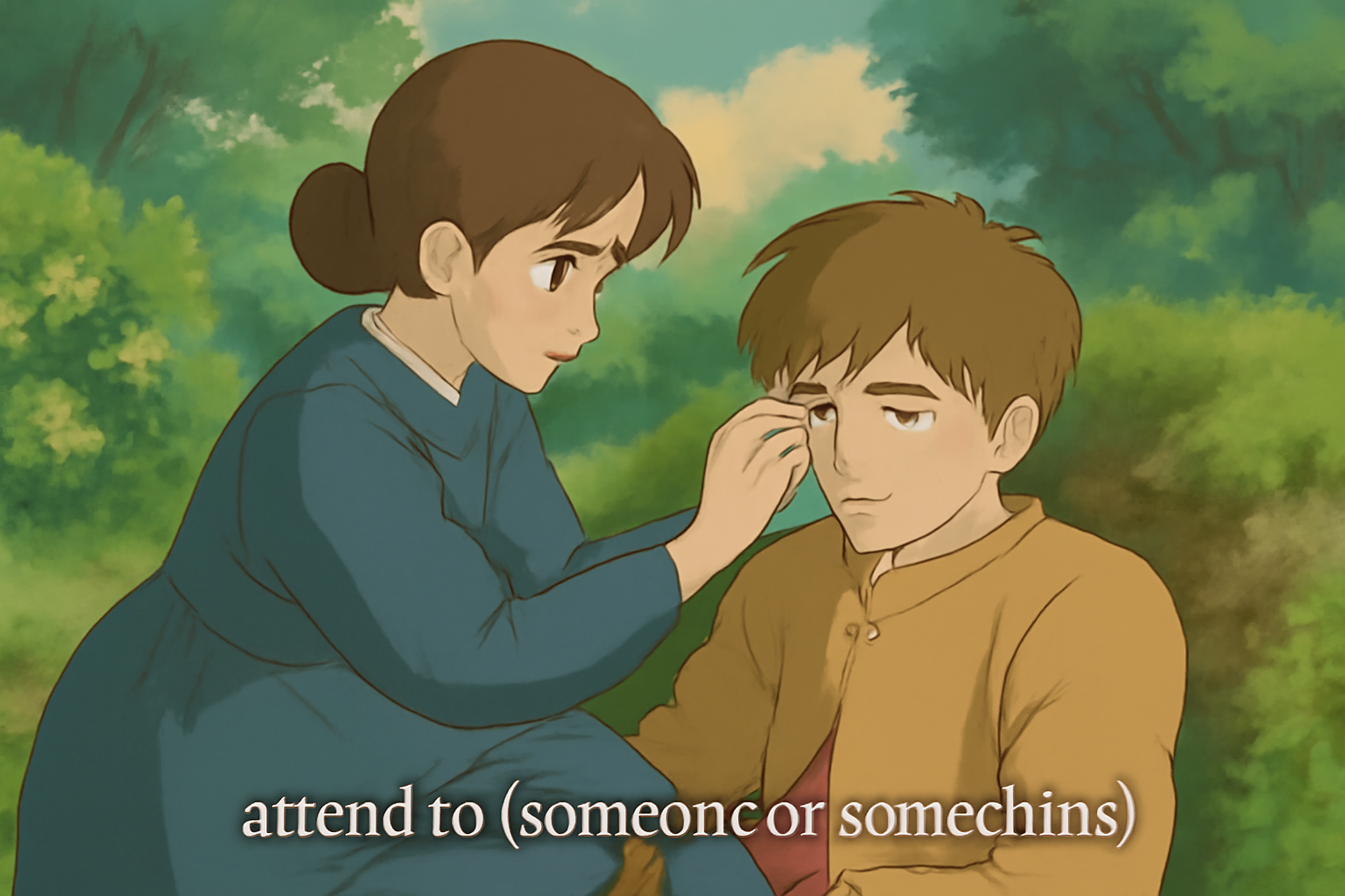 | 동사 | 돌보다, 시중들다 | A nurse attended to the patient's needs. | 간호사가 환자의 요구를 돌보았어. |