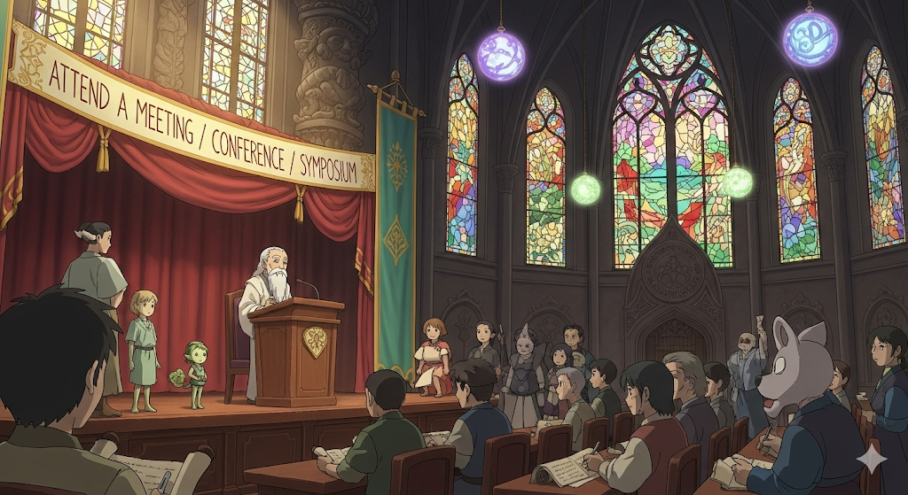 '업무'(business), '학문', 또는 '공식적인' '주제'(subject) 토론'을 목적으로 개최되는 '격식'(formal) 있는 '모임'(meeting)에 '참여'하는 행위를 의미합니다. 이는 '정보'(information) 교환', '결정'(decision) 수립, 또는 **'네트워킹'**에 초점이 맞춰져 있습니다.