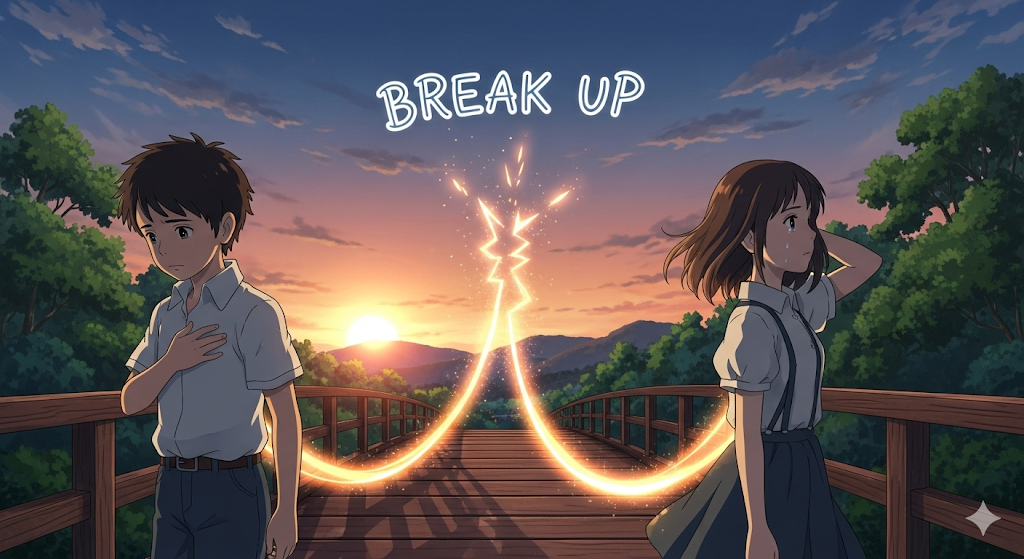 뉘앙스: 연인이나 친구 관계가 끝나는 것을 의미합니다. 또한 모임이나 그룹이 해산하는 것을 나타내기도 합니다. 여기서는 연인 관계가 끝나는 뉘앙스를 담아보았습니다.