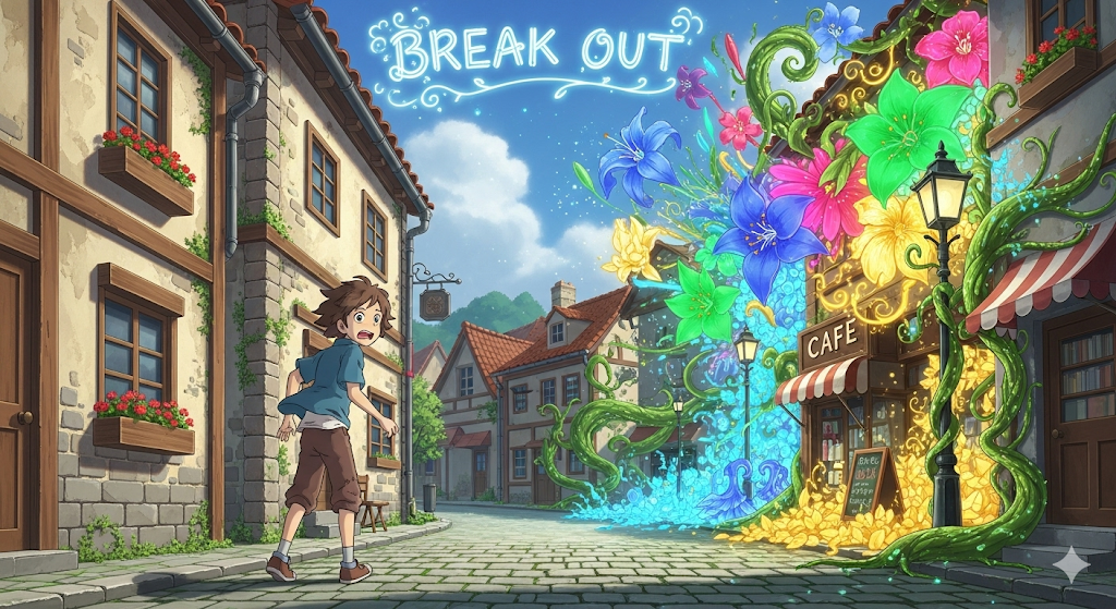 | break | 깨다, 터지다 | 동사로, '어떤' '장벽' '이나' '통제' '를' '벗어나는' '행위'. | out과 결합하여 '안' '에서' '밖으로' '갑작스럽게' '터져' '나오거나' '시작된다' '는' '의미' '를' '형성함'. |