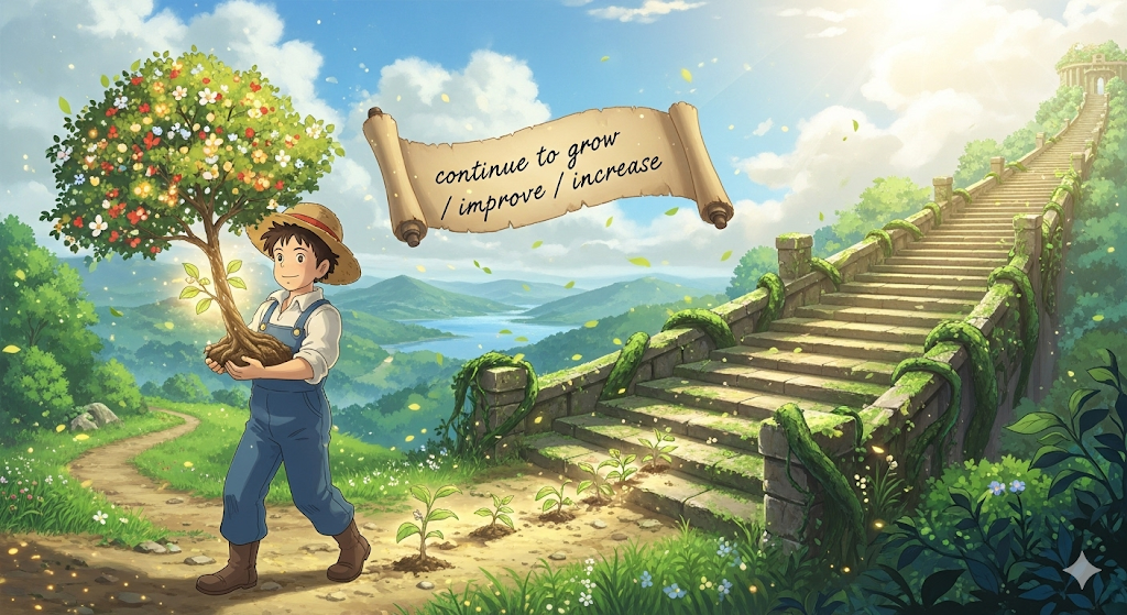 뉘앙스: 점진적으로 발전하거나 더 나은 상태로 변화하는 과정을 의미합니다. 정체되지 않고 꾸준히 더 나은 방향으로 나아가는 지속적인 노력을 강조합니다.
