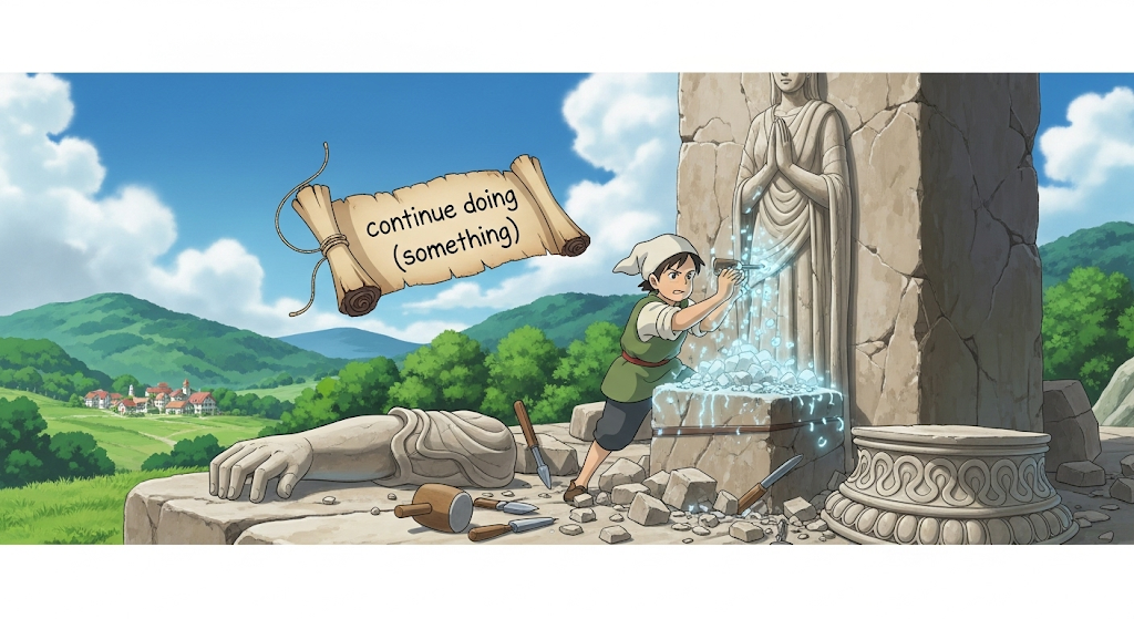 '중간'에 '멈추지' 않고, '이미' 시작된 '행동', '상태', 또는 **'과정'**을 '지속적'으로 '이어가는' 행위를 의미합니다. '중단'(interruption)이나 '종료'(end)와 대비되며, '시간'(time)의 흐름 속에서의 연속성에 초점이 맞춰져 있습니다.