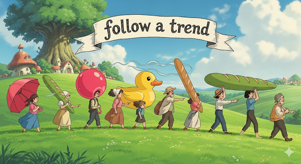 | follow | 따르다, 쫓다 | 동사로, '널리' '퍼진' '현상' '을' '모방하는' '행위'. | a trend와 결합하여 '개인' '의' '선호' '와' '상관없이' '사회적' '으로' '유행' '하는' '것을' '무비판적' '으로' '쫓아간다' '는' '의미' '를' '형성함'. |