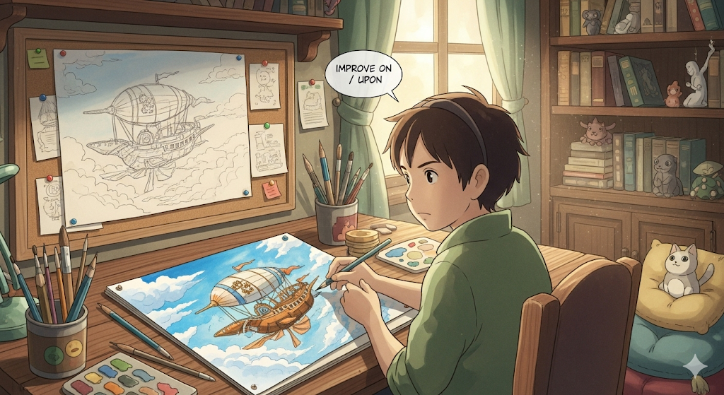 - 예문: The new model improves upon the previous version in speed and battery life.