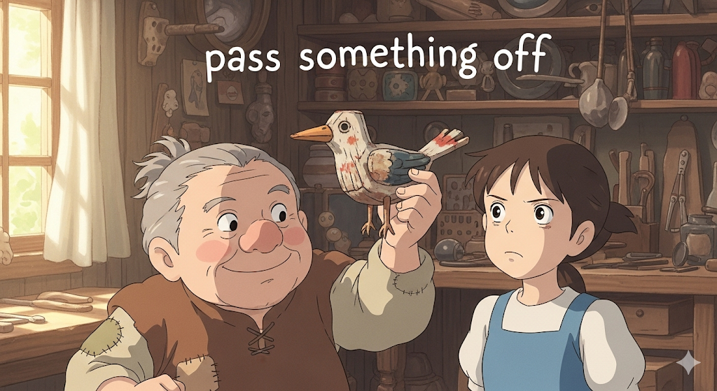 - *'pass something off'**는 속이려는 의도가 담긴 행동을 나타냅니다.