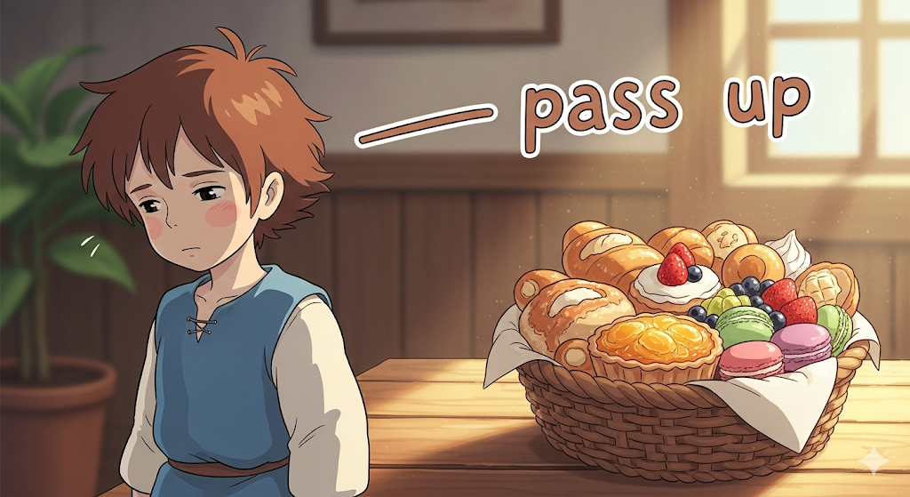 - *'pass up'**은 특히 좋은 기회를 놓쳤다는 아쉬움을 나타낼 때 사용되는 표현입니다.