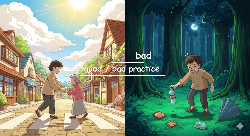 - *'good/bad practice'**는 특정 분야에서 통용되는 행동의 적절성을 평가할 때 사용됩니다.