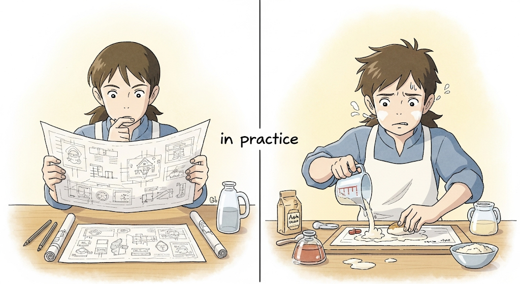 뉘앙스: 'in practice'는 "이론이나 계획과 달리 현실 세계에서 실제로 벌어지는 일"을 말할 때 사용해요. '이론적으로는 그렇지만, 실제로는 그렇지 않다'와 같은 문맥에서 자주 쓰입니다.