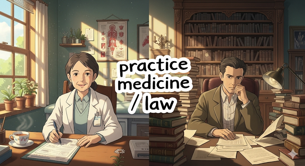 - ‘practice (a skill)’, ‘practice medicine/law’는 학업 및 직업 관련 문장에서 빈번히 사용된다.