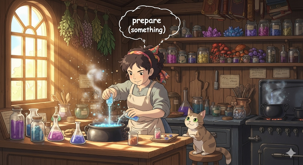- 해석: ~을 준비하다 (직접적으로 무언가를 준비하는 행위)
