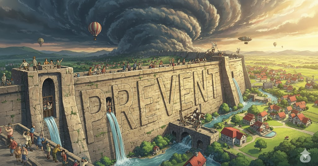 '어떤' '바람직하지' 않거나, '부정적인' '사건'(event), '결과'(consequence), 또는 '행위'(action)가 '발생'하거나 '진행'되는 것을 '사전에', 혹은 '능동적으로' '불가능'하게 만드는 행위를 의미합니다. '위험'(danger), '손상'(damage), 또는 '문제'(problem) 발생'을 '억제'하는 것에 초점이 맞춰져 있습니다.