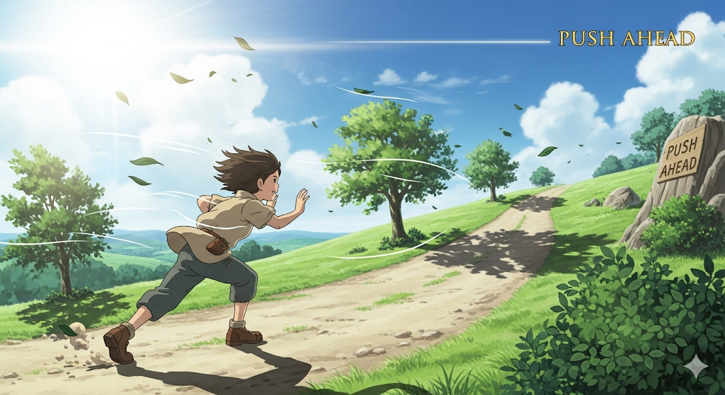 'push ahead'는 'push on'이나 'push forward'와 비슷하게 "장애물이나 방해를 무릅쓰고 '앞으로 나아가는 것'"을 의미해요. 특히 경쟁이 심한 상황에서 '경쟁자들을 제치고 앞으로 나아가는' 느낌이 강합니다.
