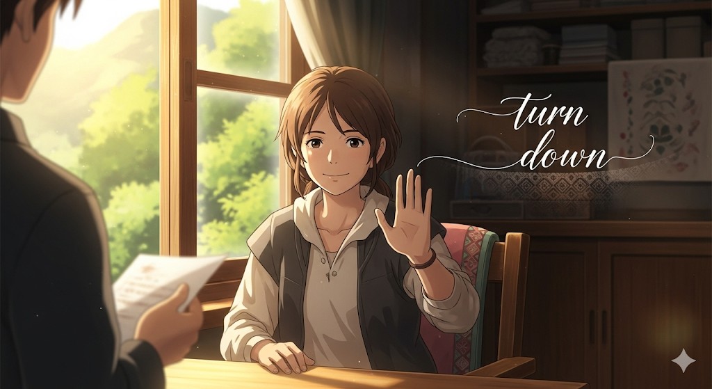 - 유의어인 "turn down"과의 의미 차이 및 쓰임새도 함께 공부하면 어휘력 강화에 도움이 됩니다.