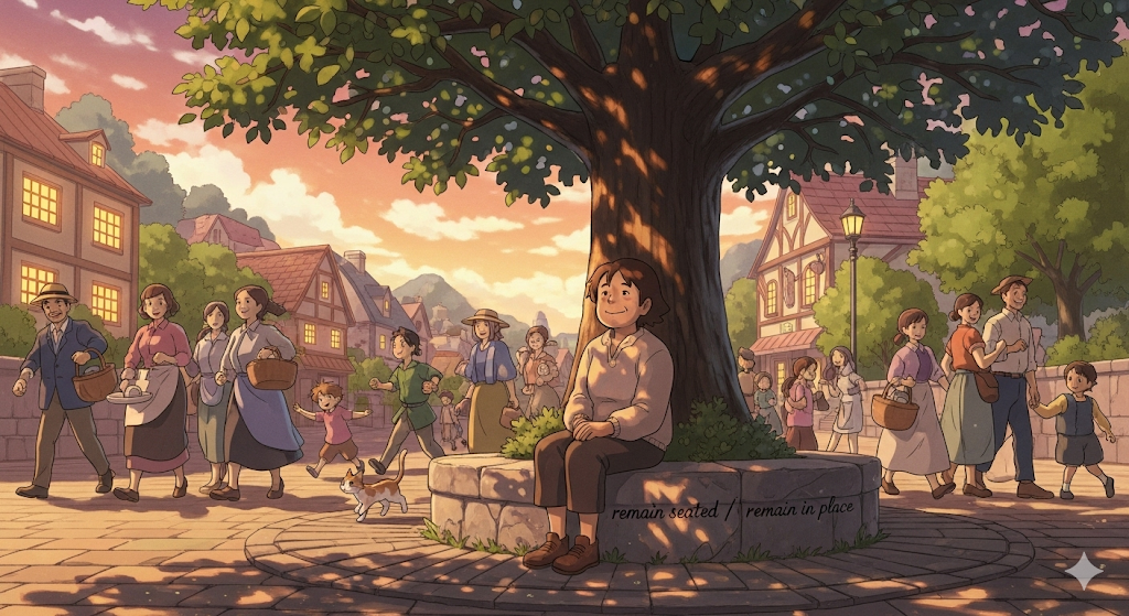 | seated/in place | 앉은/제자리에 | 부사/전치사구로, '위치' '의' '상태'. | '머무르는' '장소' '나' '상태' '를' '명확히' '해줌'. |