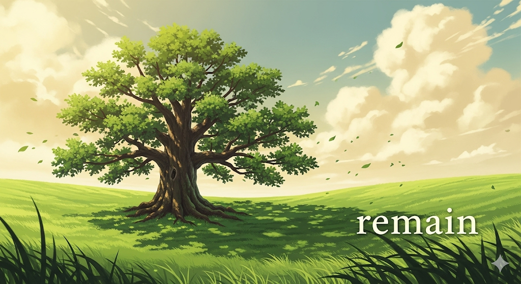 라틴어 remanere ("뒤에 남다")에서 유래 → re- ("뒤로") + manere ("머무르다")의 결합 → 원래 **'어떤 것이 떠난 후에도 뒤에 머무르는 것'**을 의미했음 → 이 의미가 현대 영어에서 '특정 장소에 계속 머무르거나, 상태가 변하지 않고 유지되는' (남아 있다, 여전히 ~이다) 동사로 발전함. 나아가 '아직 완료되지 않은 일이나 과정이 있는' ((아직) ~해야 하다) 의미를 가지게 되었어요. 명사로는 이러한 '남아 있는 부분' (남은 것, 잔여물)이나 '오래된 유적' (유적, 유물)을 나타내요. 즉, **'어떤 것이 사라진 후에도 존재를 유지하거나, 상태가 지속되거나, 또는 미완의 상태로 남아 있는 다양한 상황'**을 나타내는 핵심 단어예요.