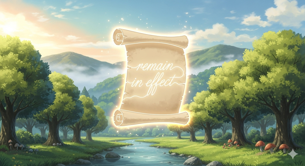 '법률'(law), '규정'(regulation), '정책'(policy), 또는 '계약'(contract) 등이 '시간'(time)의 '흐름'에 '상관없이', '현재'에도 '유효'(in effect)하고 '적용'(apply)될 수 있는 '상태'를 '유지'하는 것을 의미합니다. 이는 '법적'(legal) 또는 '공식적인' '구속력'(binding force) **지속'**에 초점이 맞춰져 있습니다.