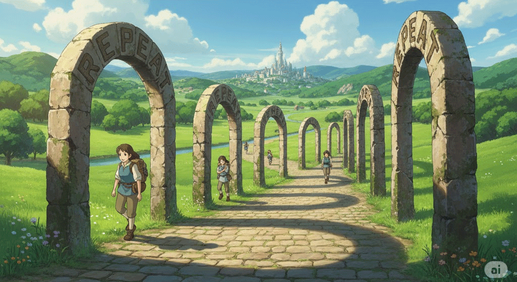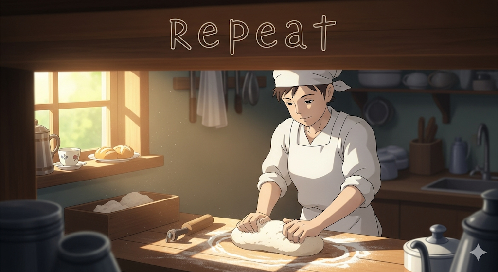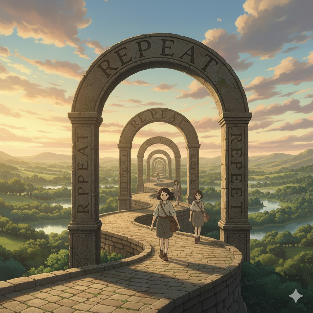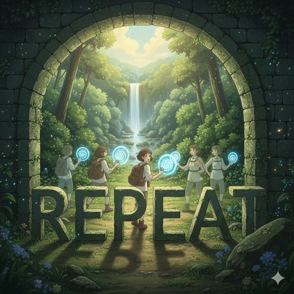 말(words), 행동(action), 사건(event), 또는 과정(process)을 '한 번' 이상 '다시' **'수행'**하거나 '발생'시키는 행위를 의미합니다. 단순히 '다시' '말하는' 것을 넘어, '패턴'(pattern)을 **'되풀이'**하거나 '습관'(habit)을 '이어가는' 개념에 초점이 맞춰져 있습니다.