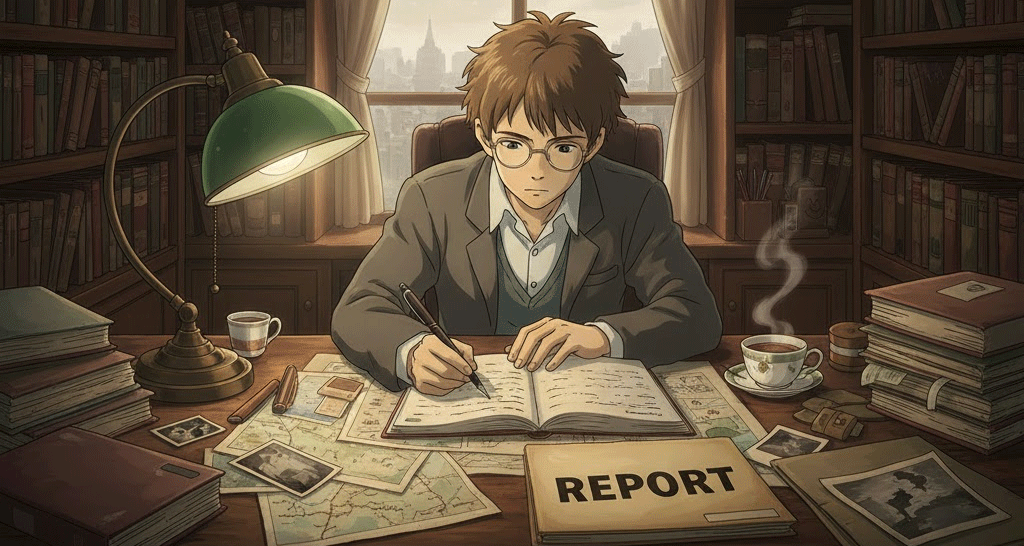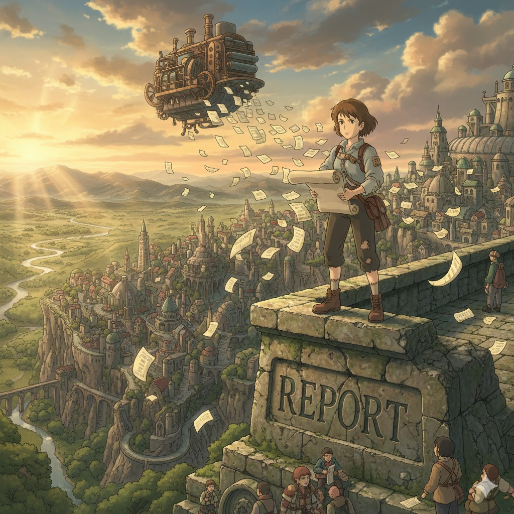 '흩어져' 있는 '정보'(information)나 '자료'(data)를 '모아서'(collect), '하나의', '체계적인' '문서'(document) **(보고서)**로 **'조립'**하거나 '작성'하는 행위를 의미합니다. '자료' 종합과 '분석'(analysis)을 통한 보고서 완성에 초점이 맞춰져 있습니다.