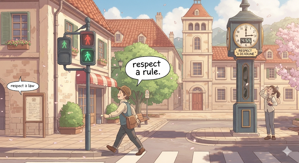 'respect a deadline/law/rule'은 사람에 대한 존경이 아닌, 규정이나 기한의 중요성을 인정하고 그에 맞게 행동하는 것을 의미하는 표현입니다.