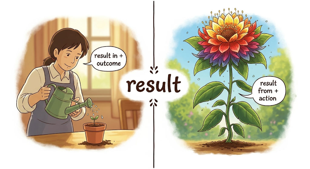 'result'는 결과 자체를 의미하고, 'result in'은 원인에서 결과로, 'result from'은 결과에서 원인으로 향하는 인과관계를 명확히 설명하는 구동사입니다.