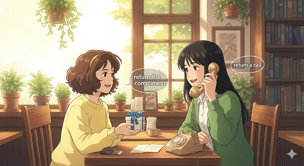 이 표현들은 물리적인 물건의 반환이 아닌, 사회적 관계에서 '되갚는' 행위를 의미합니다. return a favor는 누군가에게 받은 친절이나 도움을 갚는 것을, return a call은 부재중 전화에 다시 전화하는 것을, return the compliment는 칭찬에 대해 상대방에게 칭찬으로 답하는 것을 의미합니다.