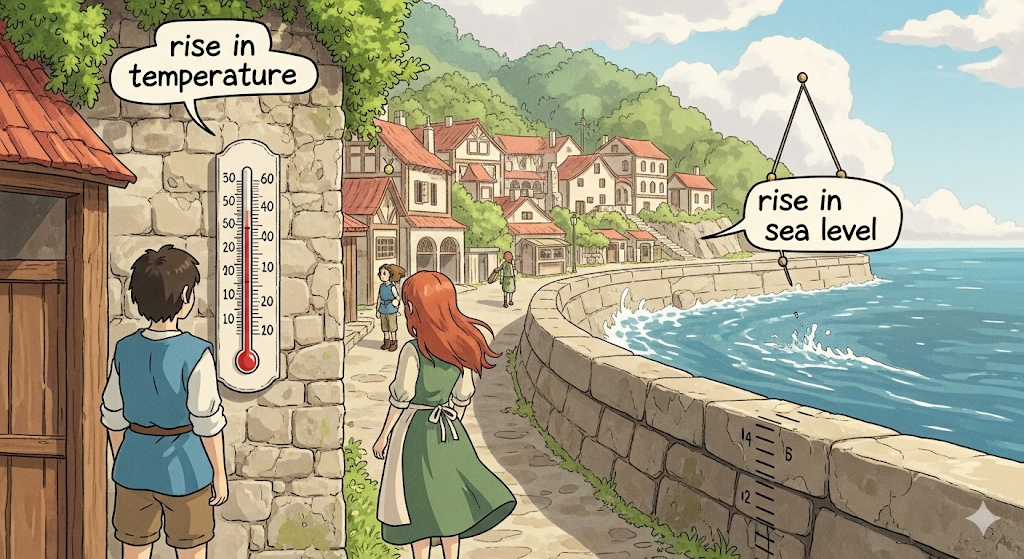 '온도'(temperature) 수치나 '바다' '수면'의 '높이' 등 '자연적' 혹은 '물리적' '측정값'이 '높아지는' 현상을 의미합니다. 특히 해수면 상승은 '기후 **변화'**와 같은 '환경적' **'문제'**를 강조합니다.