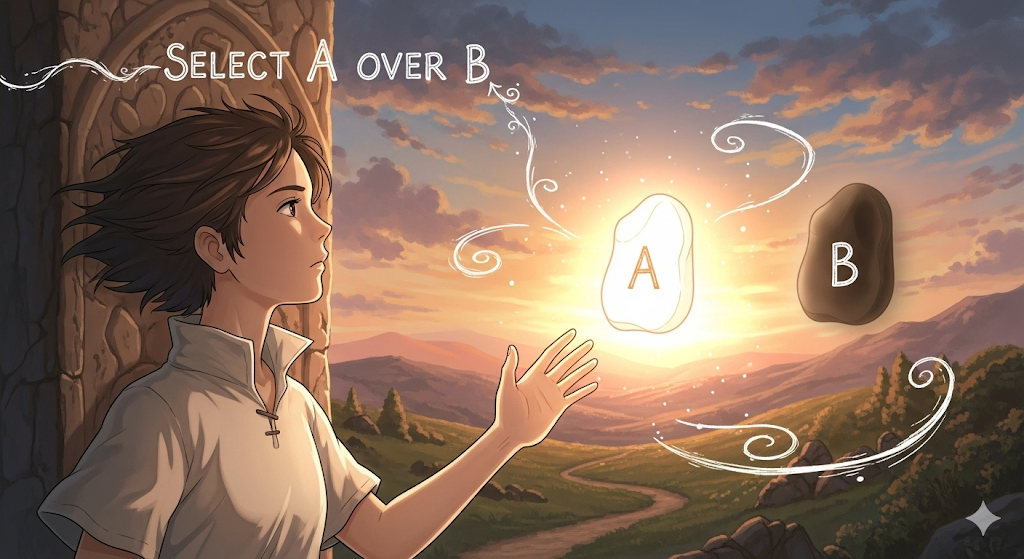 '두' 가지 '대안'(B) 사이에서, '특정' '이유'(reason or preference)를 바탕으로 'A'를 '더', 혹은 '우선적'으로 '선택'하는 행위를 의미합니다. 'prefer A over **B'**와 유사하며, 선택의 '우선순위' 결정에 초점이 맞춰집니다.