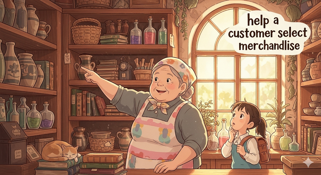 - 해석: 고객이 상품을 고르는 것을 돕다