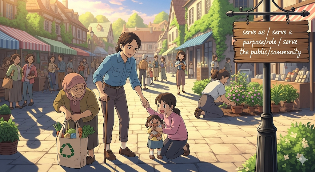 이 표현들은 'serve'가 '기능'이나 '역할'을 한다는 의미로 확장된 용례입니다. serve as는 어떤 사람이나 사물이 다른 무언가 '로서의 역할을 수행하는' 것을 나타냅니다. serve a purpose 또는 serve a role은 어떤 것이 '목적을 달성하거나' '역할을 수행하는' 것을 의미합니다. serve the public/community는 개인의 이익보다 '공동체를 위해 봉사하거나' '헌신하는' 공적인 행위를 나타냅니다.