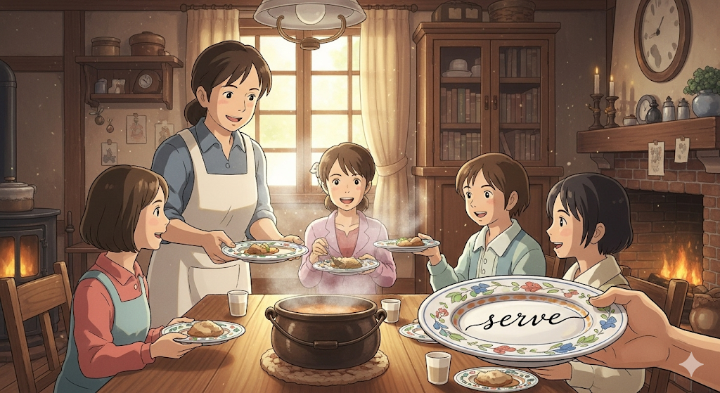 'serve'는 음식이나 서비스 제공의 기본 동사이며, 'up'은 완성된 차림을, 'for'는 용도를 강조합니다.