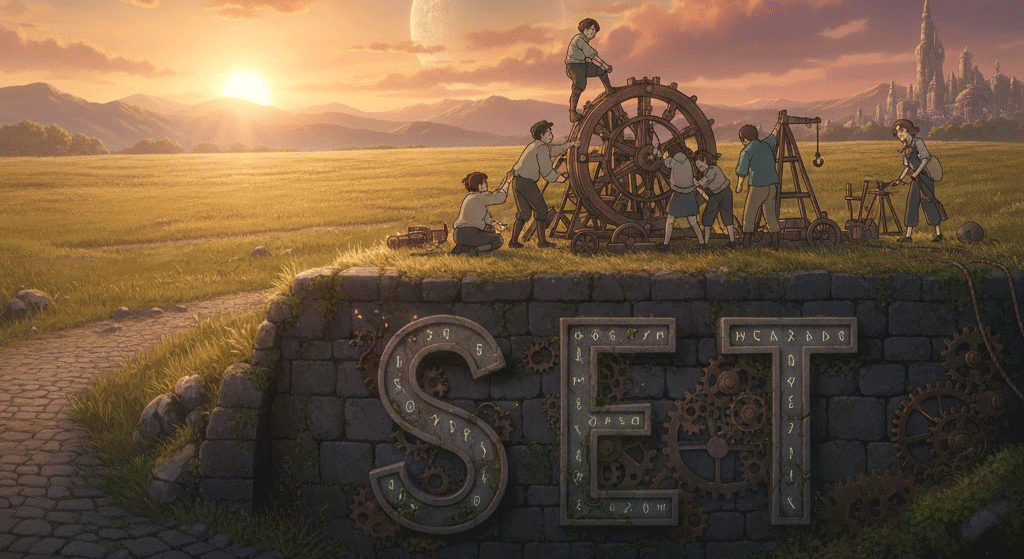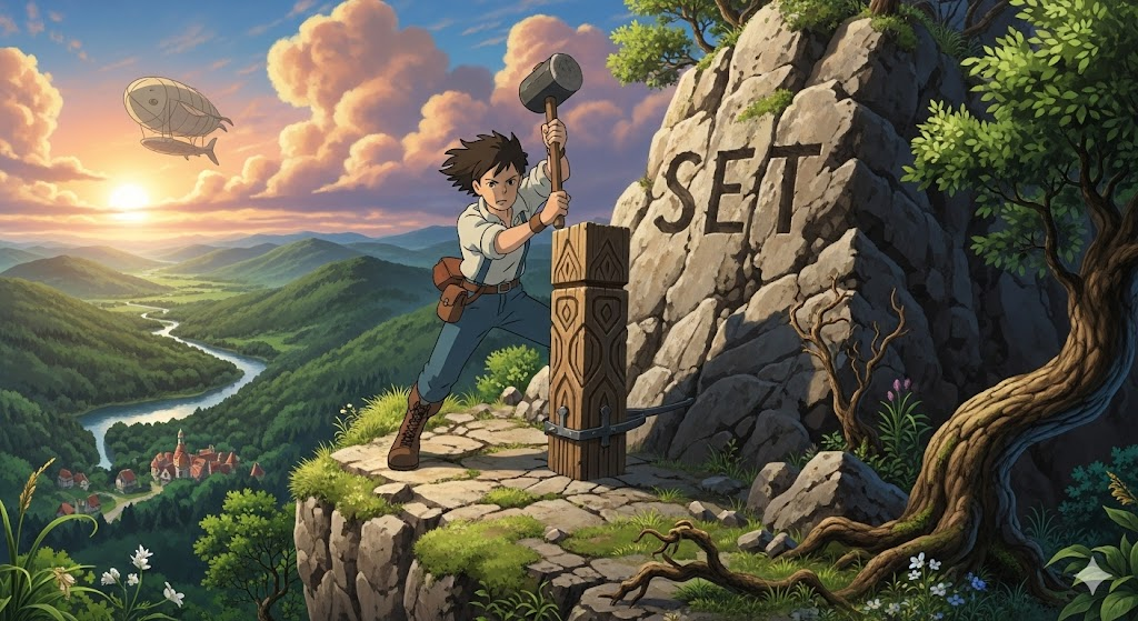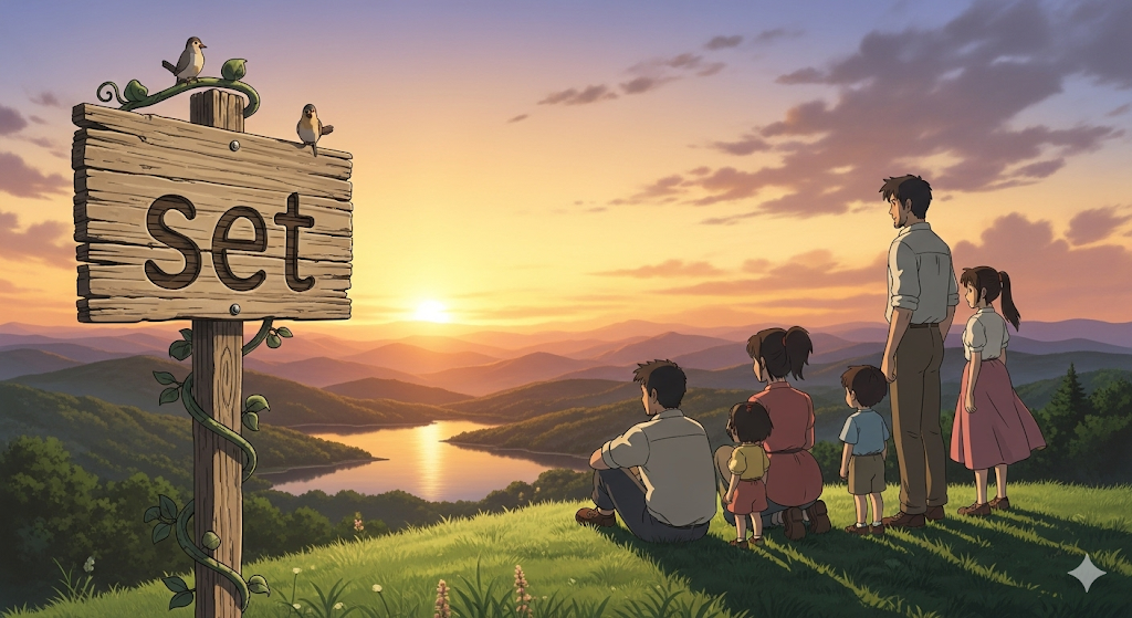 '특정' '위치'(location), '상태'(condition), 또는 **'가치'(value)**를 '정하거나', '결정'(decide)하는 행위를 의미합니다. 단순히 '두는' 것을 넘어, **'기준'(standard)**이나 **'목표'(goal)**를 **'설정'**하거나, '경화' 등 '상태'를 '고정'하는 것을 포괄합니다. 명사로는 '세트'(group)나 '배경'(background)을 뜻합니다.