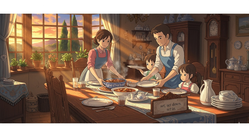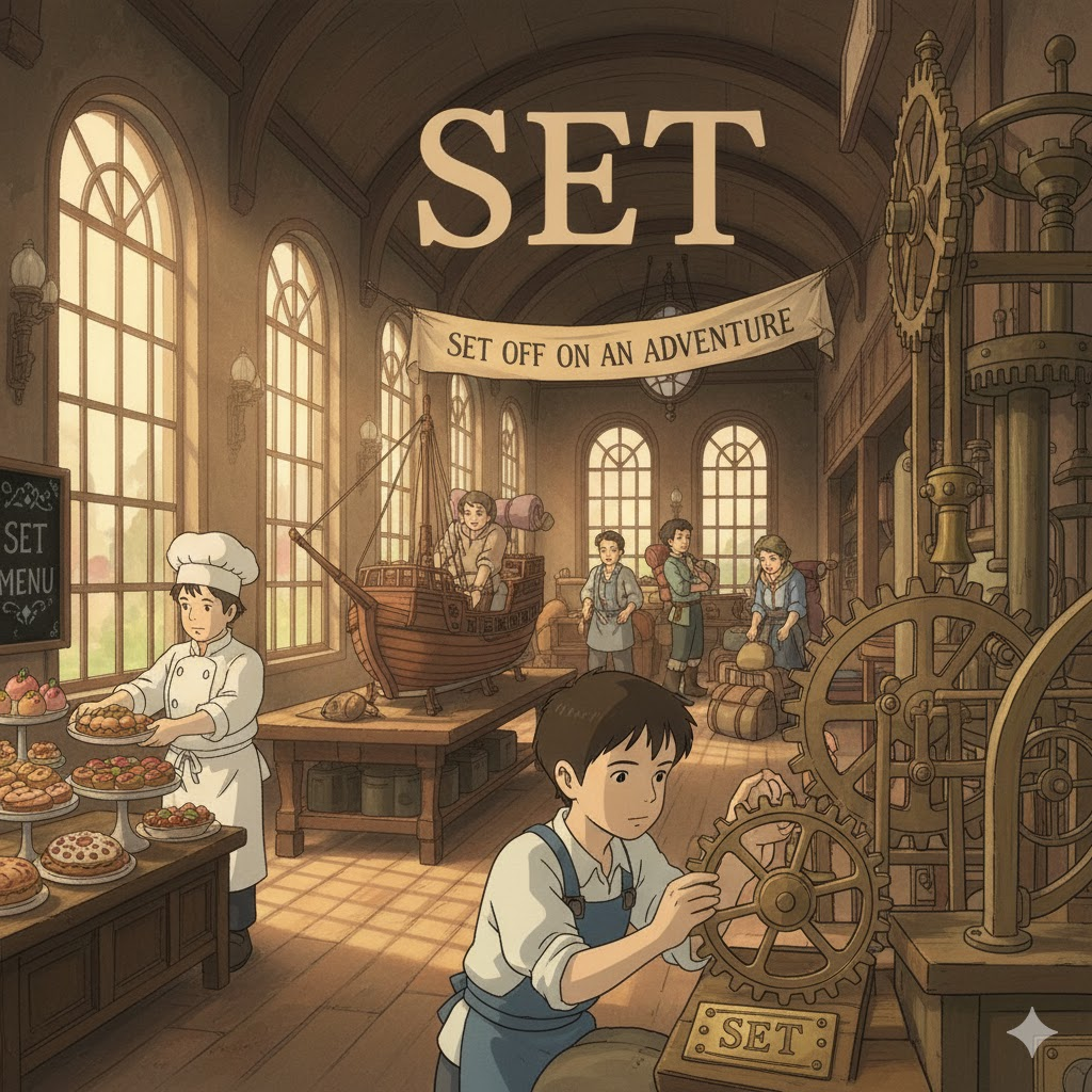 | set | 놓다, 시작하다 | 동사로, '시작' '의' '행위'. | '무언가' '를' '제자리에' '두어' '활동' '을' '위한' '준비' '를' '마치는' '것을' '나타냄'. |
