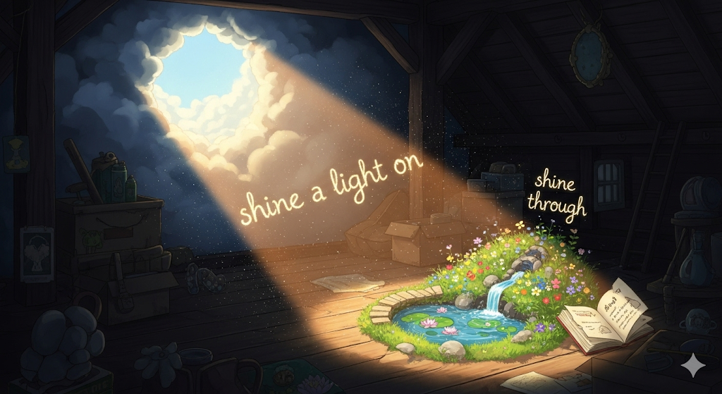 - *shine a light on**은 진실을 밝히는 것을, shine through는 어려움 속에서 진정한 가치가 드러나는 것을 의미합니다.