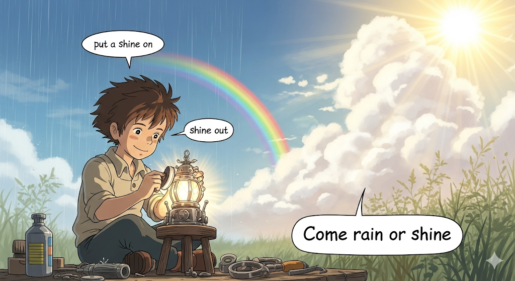 - *put a shine on**은 물리적인 광택을, shine out은 내면의 특별함이 드러나는 것을, come rain or shine은 굳은 의지를 표현하는 데 사용됩니다.