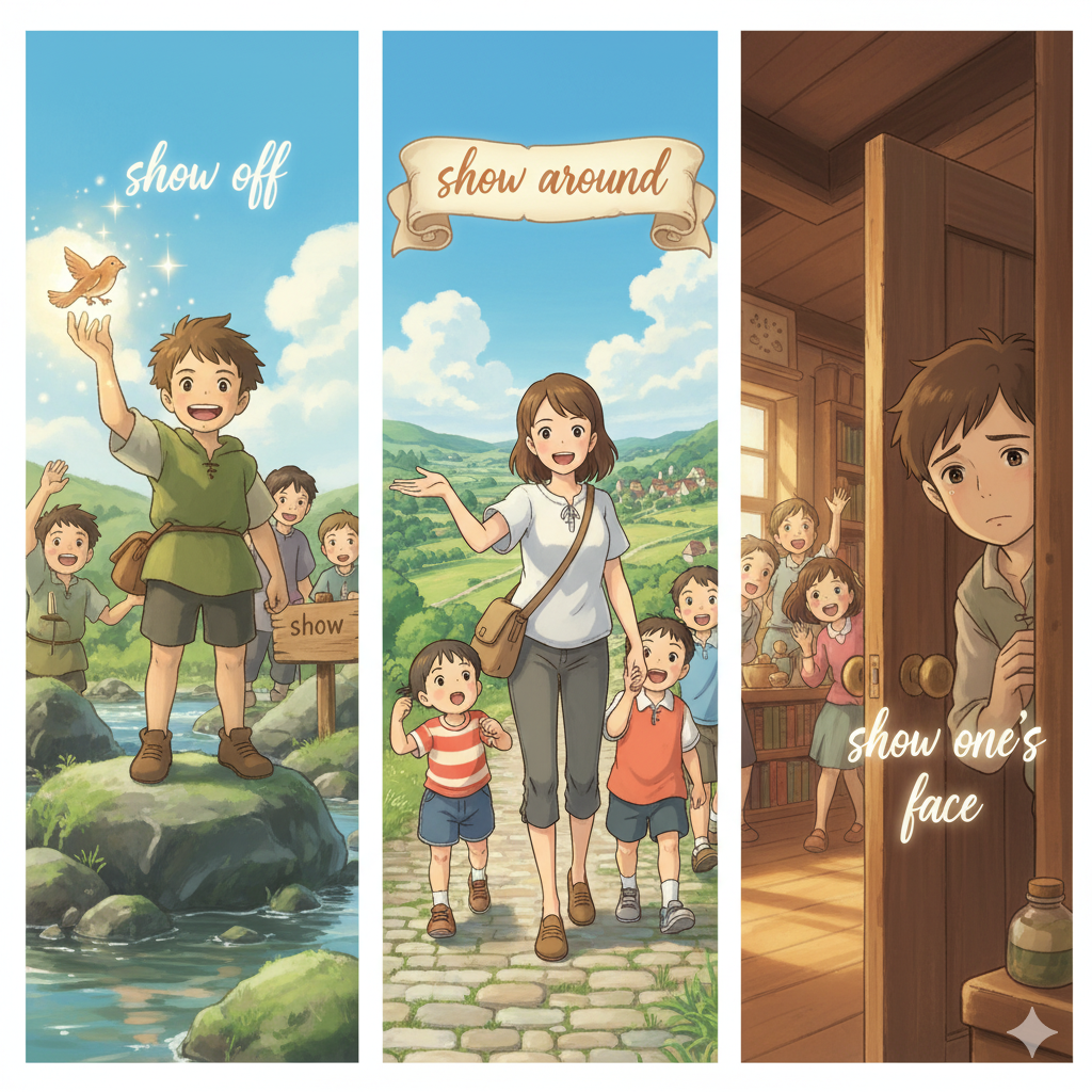 'show off'는 자랑을, 'show around'는 장소 안내를, 'show one's face'는 모습을 드러내는 것을 의미합니다.