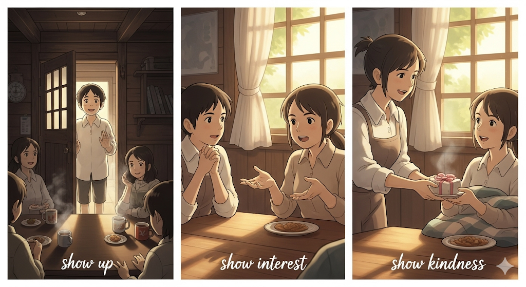 - *show up**은 존재를, show interest/kindness는 내면의 감정이나 특성을 드러내는 데 사용됩니다.