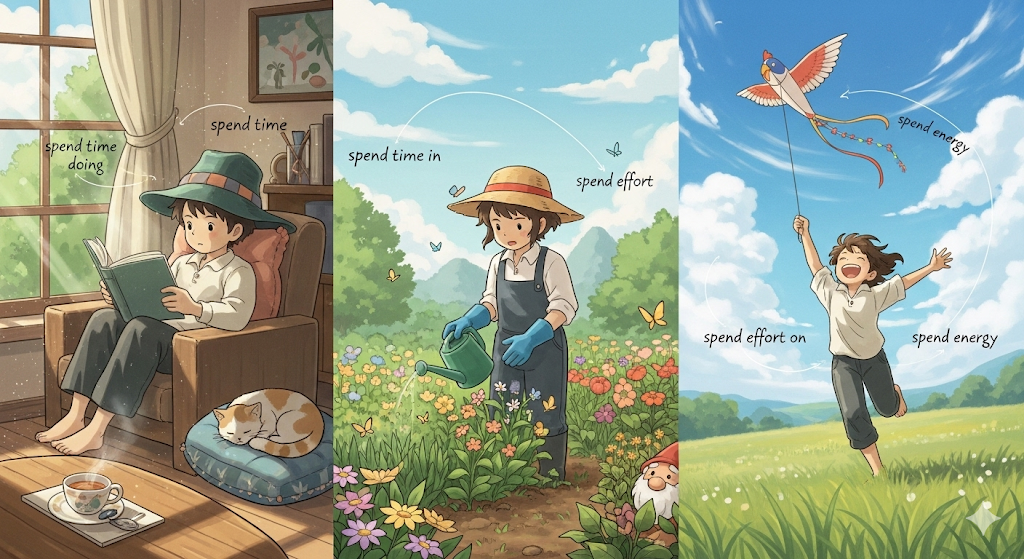 이 표현들은 돈이 아닌 시간, 노력, 에너지 같은 무형의 자원을 사용하는 것을 의미합니다. spend time doing은 어떤 행동에 시간을 사용하는 것을, spend time in은 어떤 장소에 시간을 보내는 것을 나타냅니다. spend on leisure는 '여가'라는 특정 목적에 시간이나 돈을 사용하는 것을 의미합니다. spend effort on과 spend energy는 어떤 목표를 위해 '노력'이나 '활력'을 쏟는 것을 강조합니다.