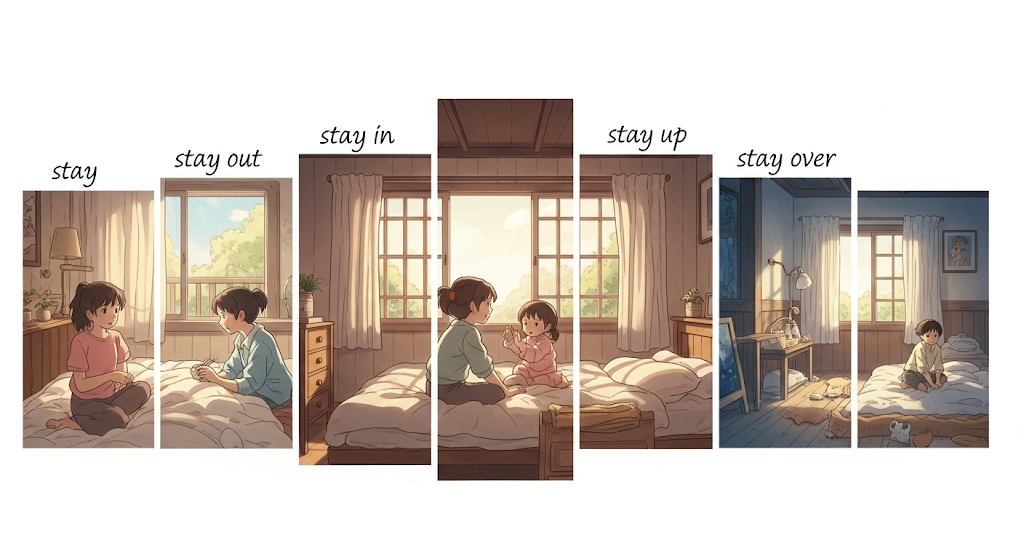 'stay'는 머무름의 기본 동사이며, 'in', 'out', 'up', 'over'와 결합하여 머무르는 장소나 상태를 구체화합니다.