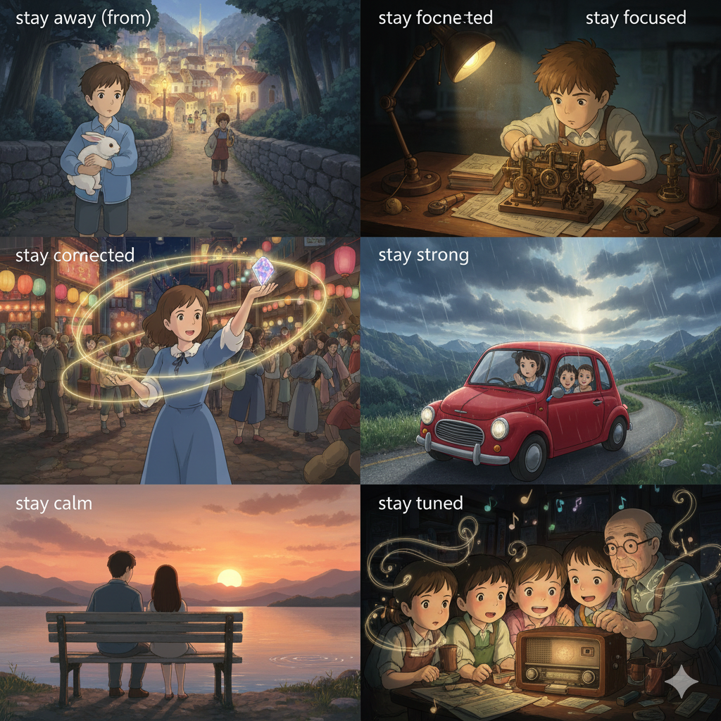 이 표현들은 '정신적, 감정적, 사회적 상태'를 유지하거나, 어떤 행동을 의식적으로 '피하는' 것을 나타냅니다. stay away (from)은 어떤 사람, 장소, 또는 문제에 '가까이 가지 않는' 것을 의미합니다. stay connected는 사람들과의 '연락이나 관계를 계속 유지하는' 것을 뜻합니다. stay focused는 '집중력을 잃지 않는' 것을, stay calm은 '침착한 상태를 유지하는' 것을, stay strong은 어려운 상황에서 '정신적으로 강하게 버티는' 것을 의미합니다. stay tuned는 방송 등에서 '계속 채널을 고정해달라'는 요청으로 사용됩니다.