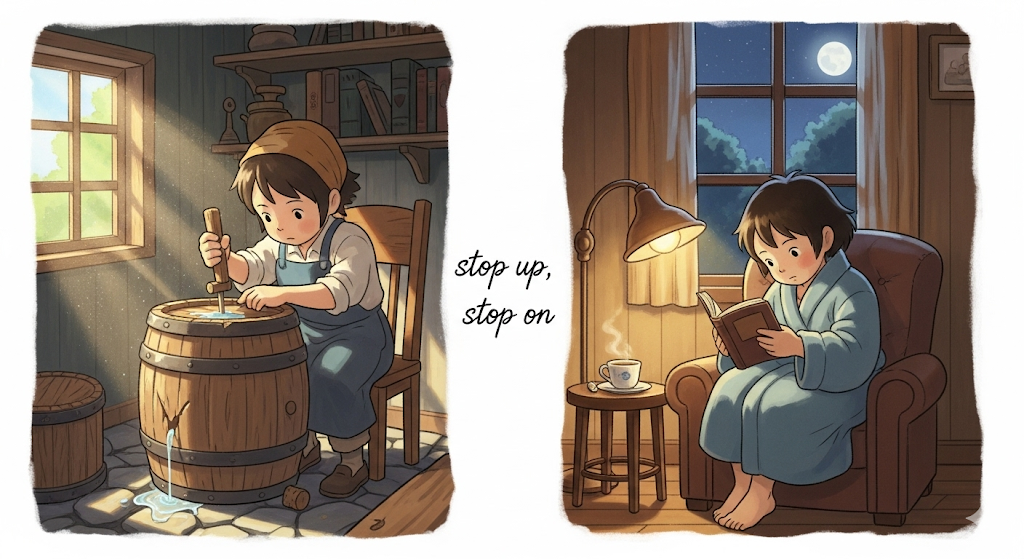 - *stop up**은 구멍 등을 막아 흐름을 차단하는 것을, stop on은 어떤 지점에서 정확히 멈추는 것을 의미합니다.