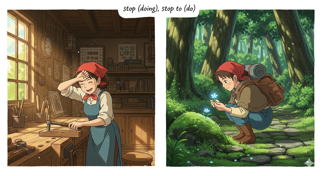 - *stop (doing)**은 행동을 끝내는 것을, **stop to (do)**는 다른 일을 위해 잠시 멈추는 것을 의미합니다.