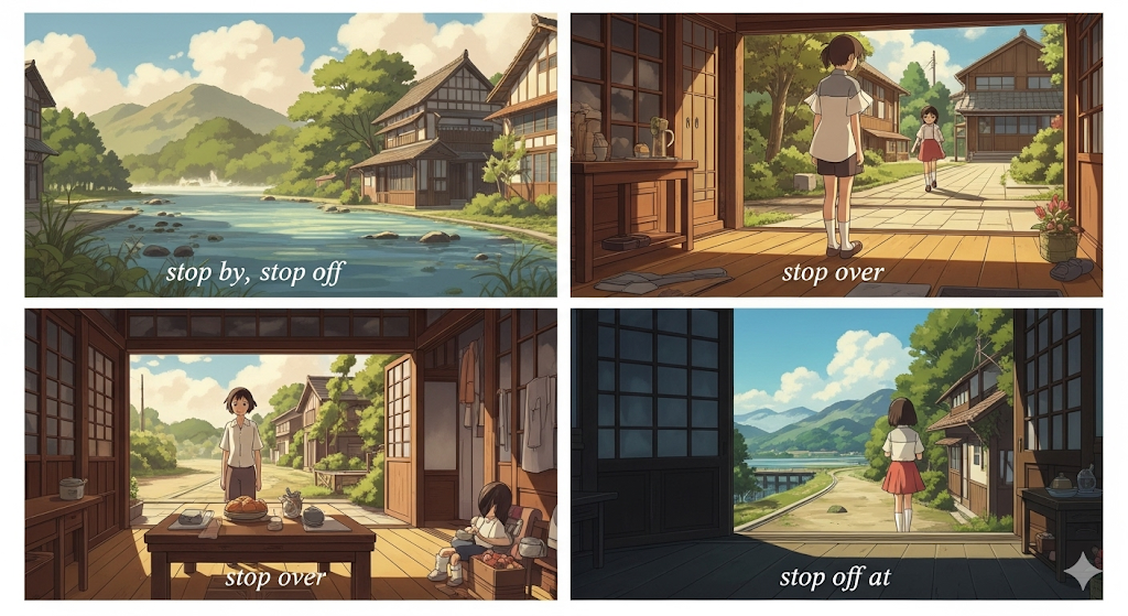 - "stop by", "stop off", "stop over" 등 다양한 구동사 숙어는 장소나 행위의 정지 및 방문과 관련된 의미를 확장시킵니다.