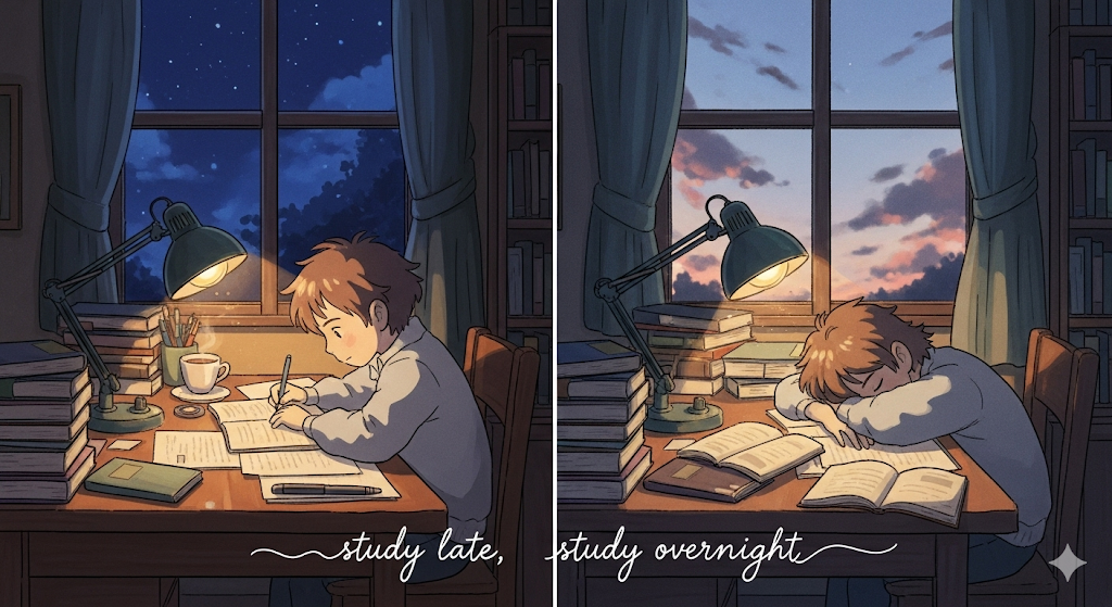 이 표현들은 '공부하는 시간의 길이'를 강조합니다. study late는 '밤늦게까지' 공부하는 것을 의미하며, 잠자리에 들 시간이 한참 지났음에도 계속 공부하는 상황을 나타냅니다. study overnight는 '밤을 새워' 공부하는 것을 뜻하며, 그날 밤의 잠을 완전히 포기하고 공부에 전념하는 것을 의미합니다.