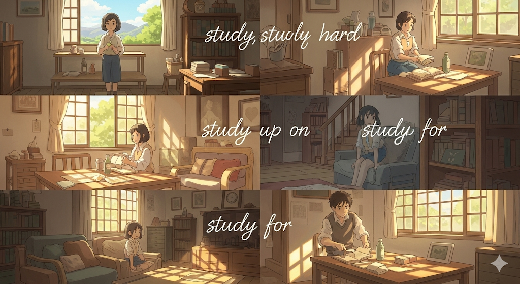 'study'는 공부의 기본 동사이며, 'hard', 'up on', 'for'와 함께 공부의 강도, 대상, 목적을 구체화합니다.