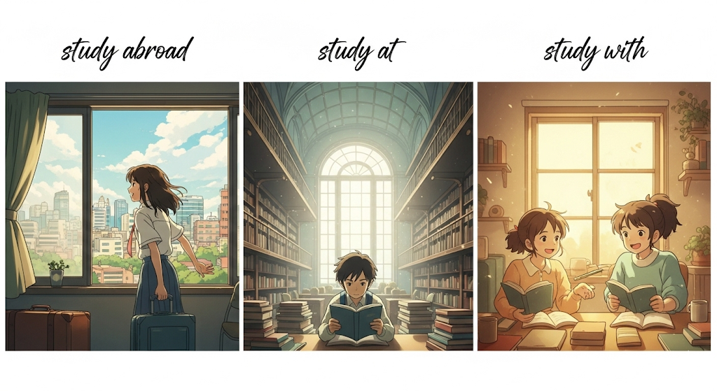 이 표현들은 공부가 이루어지는 '장소'나 '관계'를 나타냅니다. study abroad는 '다른 나라로 가서' 공부하는 것을 의미합니다. study at은 '어떤 특정 학교나 기관에서' 공부하는 것을 나타냅니다. study with는 '어떤 사람과 함께' 공부하거나, 어떤 '사람으로부터' 배우는 것을 뜻합니다.