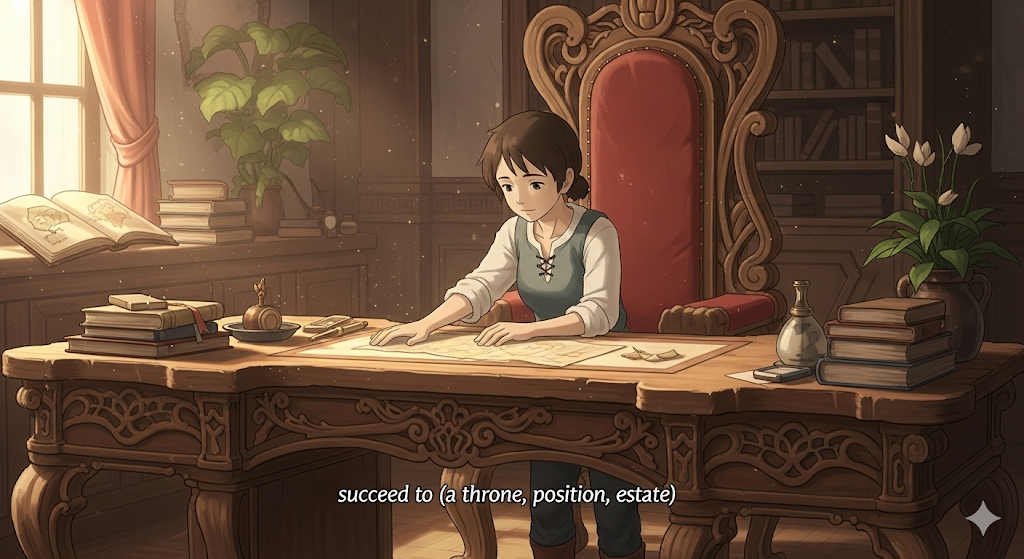 이 표현은 'succeed'의 성공이라는 일반적인 의미와는 전혀 다릅니다. 이는 '왕위, 지위, 재산 등을' '다음 순서로 물려받아' '계승하는' 것을 의미합니다. 주로 왕가나 귀족 가문, 기업의 경영권 등 공식적이고 격식 있는 맥락에서 사용됩니다.