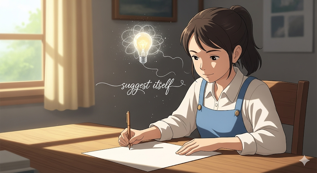 'suggest itself'는 아이디어나 해결책이 '다른 사람의 도움 없이' '스스로' '머릿속에 떠오르거나' '문득 생각나는' 것을 의미하는 숙어입니다. 주어는 사람이 아닌 '아이디어'나 '해결책'이 되며, 자발적으로 떠오르는 영감이나 생각을 나타내는 뉘앙스가 있습니다.